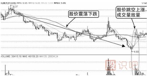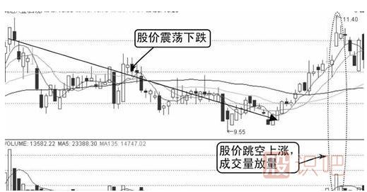由圖中可知,股價從高位震蕩下跌,成交量此時并未放大,而是保持地量水平,說明股價下跌沒有多少接盤,市場普遍不看多。股價兩次成功探底后開始展開拉升的行情,到達(dá)一定高度后出現(xiàn)跳空上漲,成交量放大,如下圖所示。