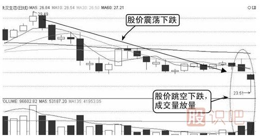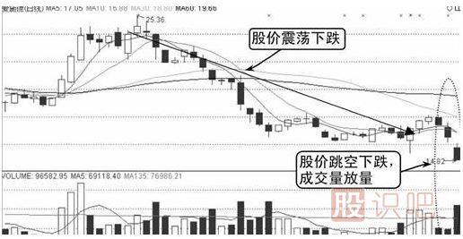 由圖中可知,該股股價從29.49元頂部開始一路下跌,股價下跌到一定幅度后開始進(jìn)行橫盤,成交量有所萎縮。隨后股價跳空下跌并伴隨放量,如下圖所示。