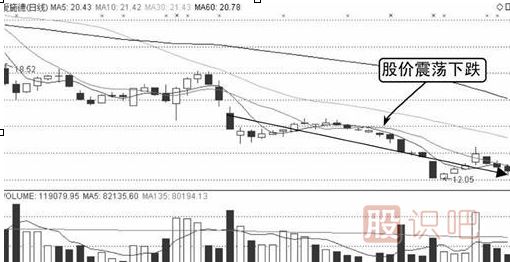 由圖中可知,股價在前期25.36元處見頂,隨之股價表現(xiàn)得極度弱勢,連續(xù)收出陰線并呈斜坡式的下跌,隨后股價在低位進(jìn)行橫盤數(shù)日。橫盤結(jié)束后,股價出現(xiàn)跳空陰跌,同時成交量放大,后市走勢如下圖所示。