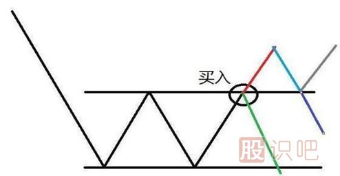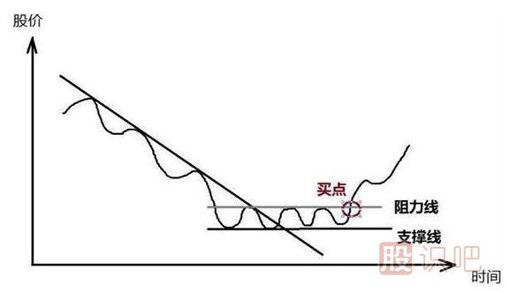 2、當(dāng)一個股票在下跌趨勢中,完成一次的震蕩之后,拒絕新低的出現(xiàn),并再次向上(而被突破)時,此時意味著空頭力量衰減,市場暫時均衡,但此時并不需要急于買入,以防震蕩后繼續(xù)重歸下跌趨勢