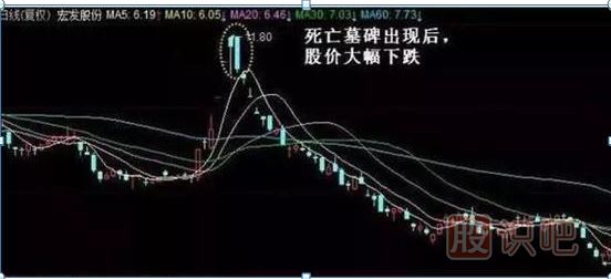 2、死亡墓碑K線組合的第二根陰線如果低開,見頂信號更強。