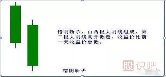 1、錯陰斬殺K線組合由兩根大陰線組成,第二根大陰線高開低走。