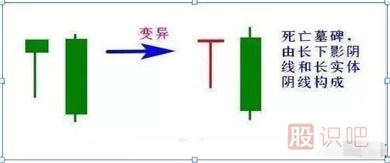 3、死亡墓碑K線組合變異為T+陰線時是見頂信號,部分個股短期殺跌后略有反彈。