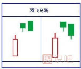 4、第二跟陰線(xiàn)實(shí)體可長(zhǎng)可短,如下穿到前面陽(yáng)線(xiàn)實(shí)體1/2處,則轉(zhuǎn)化成黃昏之星變化圖形。由此可知二根高開(kāi)低走的陰線(xiàn),好象兩只烏鴉在空中盤(pán)旋,所以定義為雙飛烏鴉。很少出現(xiàn),變化圖形出現(xiàn)比較多,一旦出現(xiàn),做多力量嚴(yán)重不足,跌勢(shì)將開(kāi) 始。