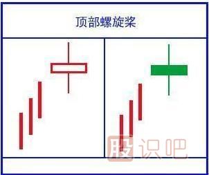 3、上下影線(xiàn)很長(zhǎng)且基本等長(zhǎng),很像飛機(jī)上的螺旋槳,且頂部出現(xiàn),所以叫頂部螺旋槳。頂部螺旋槳是轉(zhuǎn)勢(shì)信號(hào),特別是有一段大漲幅后出現(xiàn),下跌信號(hào)更加明確。