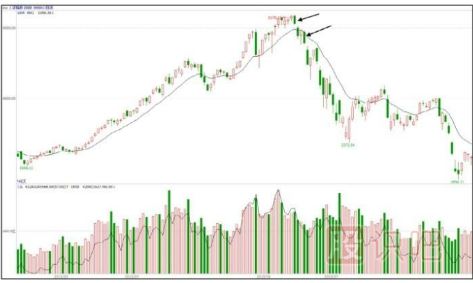 13、當大盤創(chuàng)新高,出現(xiàn)價背離情況時,該股卻沒有出現(xiàn)價量背離。