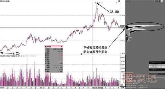 如圖所示,航天動力的日K線中再次出現(xiàn)了單峰密集籌碼形態(tài)。隨著之后的成交量進(jìn)一步放大,股價繼續(xù)上攻,達(dá)到了新的高位。圖中單峰密集籌碼形態(tài)中,下方存在的大量籌碼,是主力能夠創(chuàng)新高的動力。股價之所以創(chuàng)新高,也正是底部籌碼支撐作用的結(jié)果。
