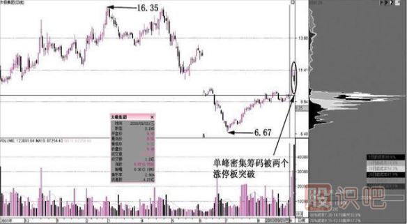 如圖所示,太極集團(tuán)的日K線圖中,股價的反彈過程中出現(xiàn)了單峰密集籌碼形態(tài)。之后,考慮到該單峰密集籌碼出現(xiàn)的位置,即處于股價的底部區(qū)域,這顯然是一個非常好的建倉機(jī)會。在成交量沒有發(fā)生太大變化的情況下,該股出現(xiàn)了連續(xù)兩個漲停板,突破了單峰密集籌碼區(qū)域,顯然就是短線獲利機(jī)會了。