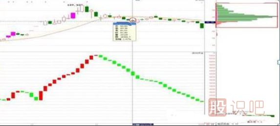 觀察下圖可以發(fā)現(xiàn),圓圈處那天,籌碼集中于11.4元左右,但是當(dāng)天的價格是10元,說明上方有大量的套牢盤,想在該處進(jìn)行強(qiáng)勢上漲比較困難,因為上方套牢盤很重,上攻的壓力也變得很重,需要時間來進(jìn)行調(diào)整。