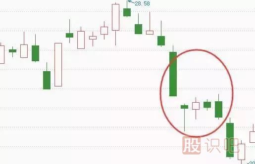 下降三法又稱下跌三部曲,出現在股價下跌過程中,由大小不等的5根K線組成。這5根K線中,第一根K線為大陰線或中陰線,接下來三根為小陽線,但都沒有向上突破前面第一根陰線的開盤價,之后出現一根大陰線或中陰線,且其收盤價要低于第一根陰線的收盤價。