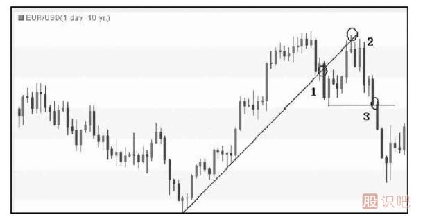 圖1-1是歐元/美元日?qǐng)D走勢(shì)。匯價(jià)首先跌破了上行趨勢(shì)線,滿足了條件1。之后匯價(jià)再次上探前高,未能創(chuàng)下新高,滿足了條件2(高位錄得一根吊頸K線),之后匯價(jià)跌破了兩個(gè)高點(diǎn)之間低點(diǎn),即最近低點(diǎn),滿足了“跌破前低”的條件3。投資者可以選擇匯價(jià)在突破低點(diǎn)、滿足第三個(gè)條件時(shí)做空,這一法則的順序是1——2——3。