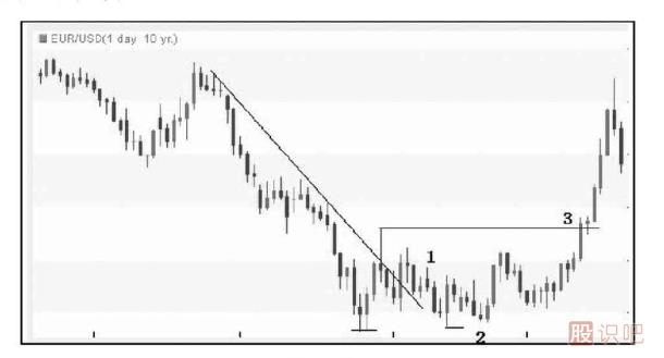 圖1-5是英鎊/美元日?qǐng)D走勢(shì)。匯價(jià)受到下行趨勢(shì)線打壓持續(xù)下跌,但是創(chuàng)下最低點(diǎn)后,匯價(jià)開(kāi)始反彈,下方的次低點(diǎn)形成(達(dá)到條件2)。其后匯價(jià)突破了最低點(diǎn)和次低點(diǎn)之間高點(diǎn)(條件3形成),并最終突破趨勢(shì)線(達(dá)到條件1)。本例中123法則形成的順序是2——3——1。