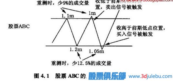 舉例來說,圖4.1顯示了假想股票ABC的折線圖。我們稱這種交易結(jié)構(gòu)為反復(fù)考驗(yàn)低成交量圖。