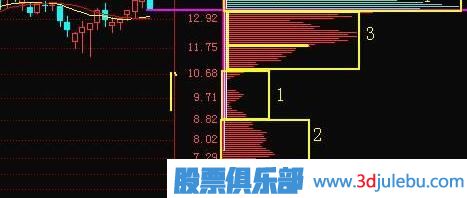 如 圖。我們先熟悉一下籌碼分布的基本概念。K線圖右側(cè)的這個像是橫著放倒的山峰形狀的指標(biāo)圖形就是籌碼分布。它其實(shí)是由與價格橫向?qū)?yīng)的一條條橫線組成,而這些橫線的長短,就代表著有多少持倉成本為該價格位置的股份數(shù)量存在,根據(jù)所有股份(流通盤)的持倉成本擺放在相對應(yīng)的價格橫線上,就得到了這樣的一個圖 形。