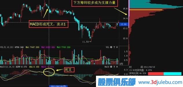 表明市場下跌的動能已經(jīng)暫時占據(jù)優(yōu)勢,但其籌碼堆積起到了支撐的作用,而MACD形成死叉的位置也就是第一個賣出點(diǎn)的位置。我們再看看下圖看這個股之后的走勢。