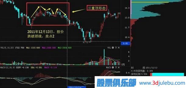 【操作技巧】繼續(xù)分析該股的走勢,可以看出該股形成了三重頂?shù)男螒B(tài),在2011年的12月13日的時候,股價向下跌破了三重頂形態(tài)的頸線位置,出現(xiàn)了該股的第二個賣點(diǎn),投資者要仔細(xì)的分析股價走勢,把握賣出的時機(jī)。