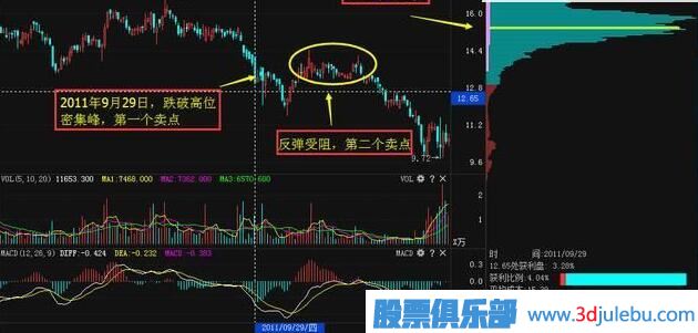 賣點(diǎn)1:9月29日,股價跌破前期高位密集峰,下跌的趨勢逐步形成,是股票賣出點(diǎn)的第一個位置;