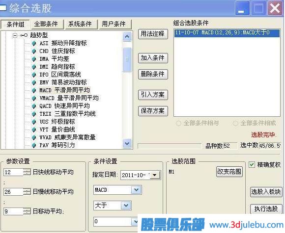 0,點“改變范圍”--“MACD選股”,選擇周期為“日線”,再點加入條 件,最后點選股入板塊,然后新建板塊名稱:“M1”,點確定,將日周期的MACD大于0的股票選入到M1板塊,目標縮小到52個股票。