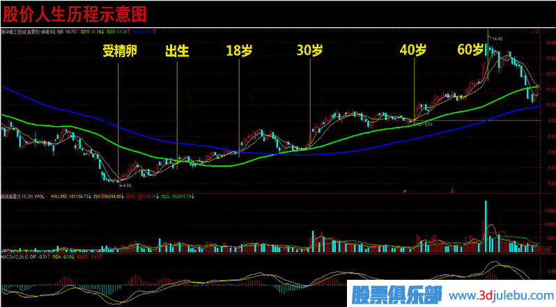 5、經(jīng)過第二波的上漲和調(diào)整后,股價迎來最后的瘋狂拉升,這時人氣極度旺盛,陽氣十足,猶如40-60歲的成功人士一樣,在經(jīng)歷了幾十年的摸爬滾打后,此時人脈廣達、官運亨通、財富一方、所向披靡,整個人生走向巔峰。但伴之而來的是年紀(jì)的增大和體力的不支,全身各個器官不斷老化、衰竭。人生已至幕年,一生所創(chuàng)造的所有榮譽和輝煌都將伴隨著生命的消失而灰飛煙滅。股價猶如流星般大幅下挫,開始它新的輪回。