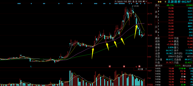 北新路橋2017/5/19,在股價沒有跌破20日中線趨勢線的時候,個股一直沿著均線平穩(wěn)運行,19日股價跌破20日均價線,宣告中線趨勢徹底結(jié)束,開始了還債行情。