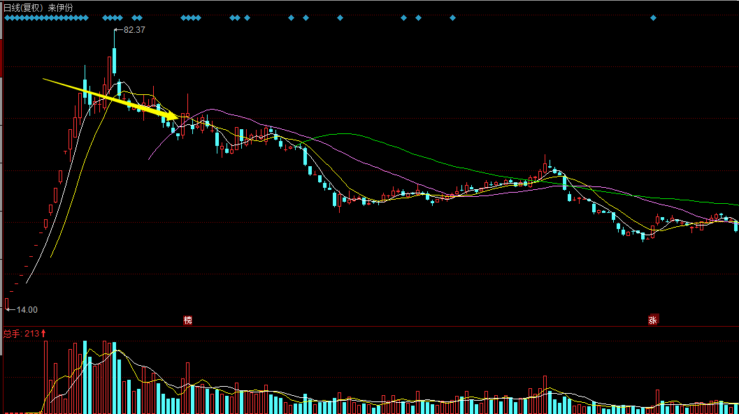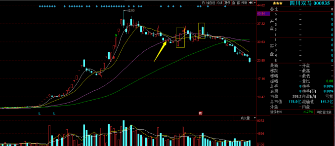 對于龍頭個股,短線見頂后,均線系統(tǒng)的5日均價線下穿10日線通常是個危險的信號,通常伴有大陰線,這時股價趨勢由多頭趨勢轉(zhuǎn)成空頭趨勢。