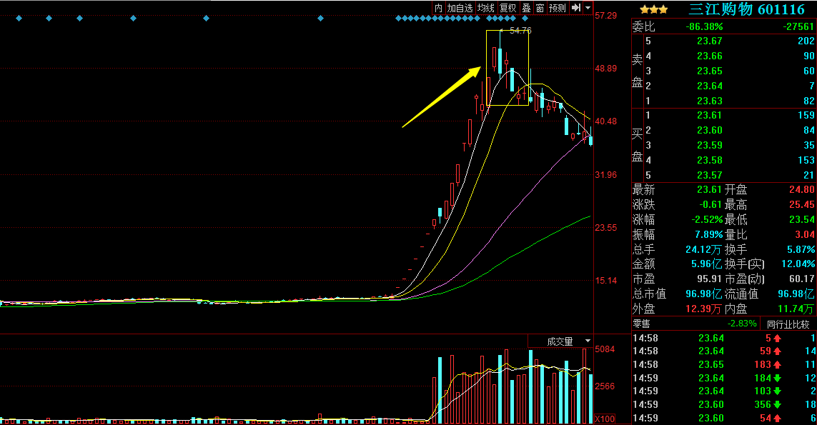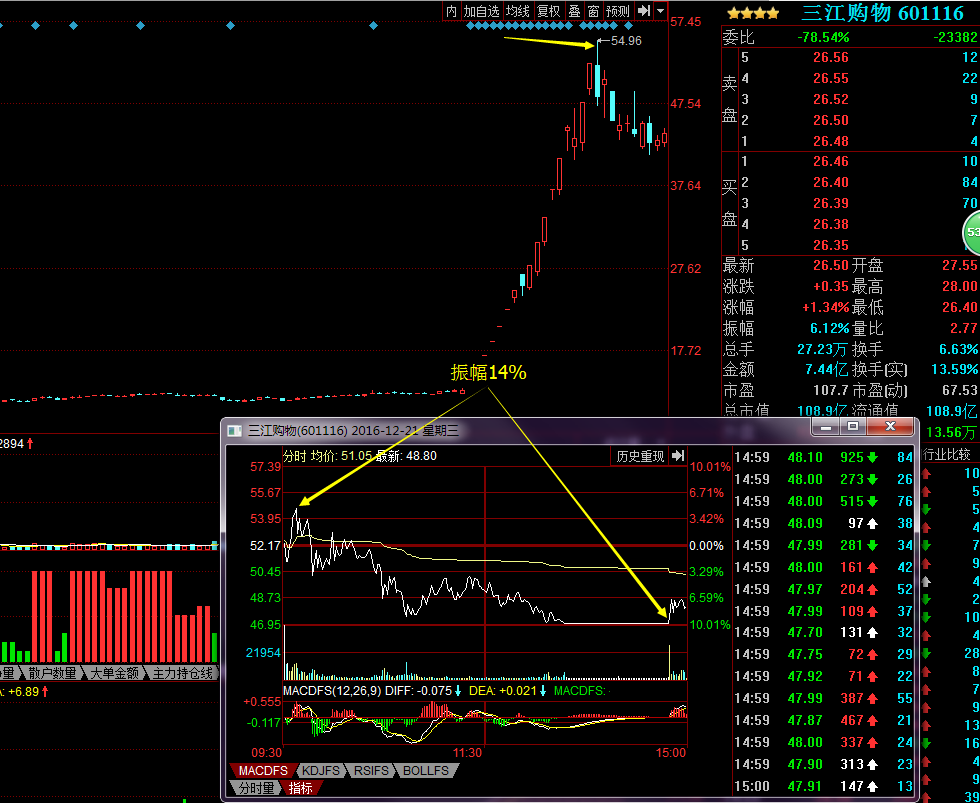 三江購物2016/12/21,20日還是漲停板走勢,21日平盤開盤,表現(xiàn)的很弱勢,隨后并沒有沖高,而是逐級下跌無力反彈,當(dāng)天也是大幅放量,是20日的倍量了,短線見頂。