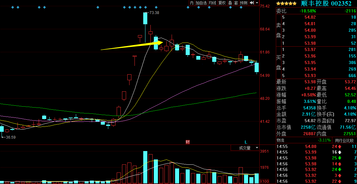 順豐控股2017/3/8,龍頭股收出見頂線組合后,股價跌到10日位置,雖然有反彈,但力度往往也不大,整體的趨勢已經(jīng)很難扭轉(zhuǎn)了。