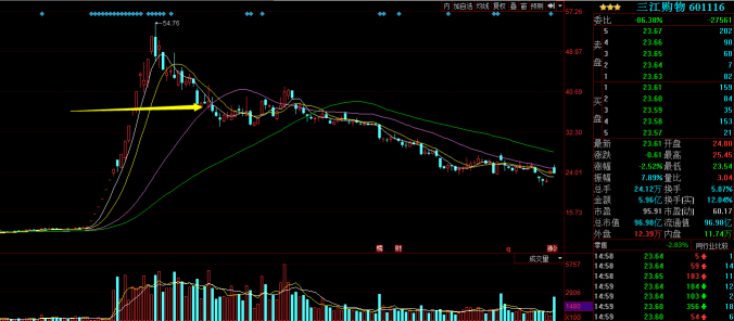 龍頭個股在高位收見頂K線組合后,短線通常調(diào)整2-3個交易日,高位橫盤,等待五日線上移,而后大概率會跌破五日線。