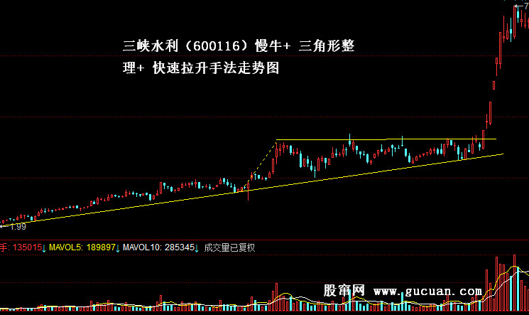 圖3 三峽水利(600116)慢牛+ 三角形整理+ 快速拉升手法走勢(shì)圖