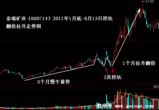 (2)挖坑模式:慢牛蓄勢(shì)+ 挖坑洗籌+ 快速拉升