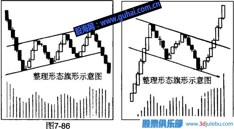 旗形整理形態(tài):股價(jià)進(jìn)入盤旋整理階段,多空雙方爭戰(zhàn)雖呈拉鋸戰(zhàn),但從圖形看,仍有一方居上風(fēng),使行情逐步上升或下移,若將股價(jià)移動(dòng)上端與下端各連成一條直線,會(huì)出現(xiàn)兩種圖形,一為上升旗形(如圖7—15),一為下降旗形(如圖7—16)。