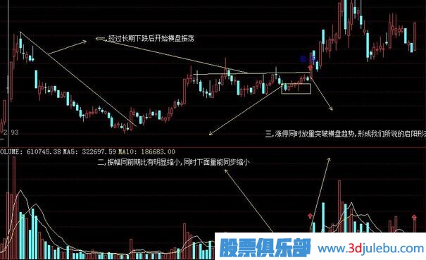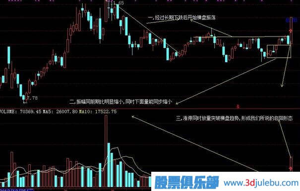 三,漲停同時(shí)放量突破橫盤趨勢,形成我們所說的啟陽形態(tài)