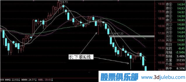 從上圖中可以看出,雖然K線收出了長(zhǎng)下影線,但股價(jià)并沒(méi)有獲得支撐,而是繼續(xù)下跌。