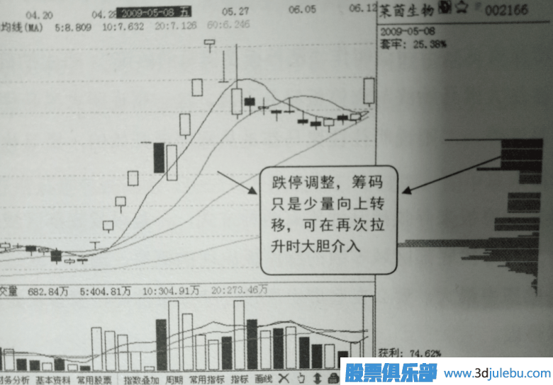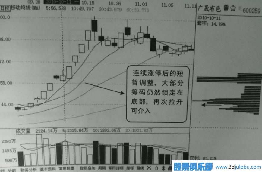 圖中右邊的籌碼分布顯示該股在跌停調(diào)整當(dāng)天大部分籌碼仍然鎖定在股價底部,因此可判斷出主力此時并沒有開始真正出貨,進一步拉升有望,因此只要籌碼不再向上繼續(xù)快速轉(zhuǎn)移而出現(xiàn)再次拉升則可快速跟進,結(jié)果如圖所示該股在跌停后隨即不入連續(xù)漲停的走勢,如果能快速跟進短線收益非??捎^。