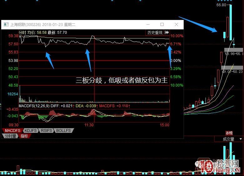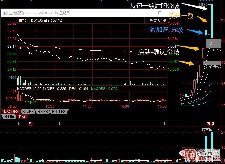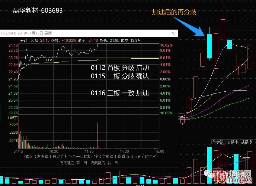 比如:創(chuàng)業(yè)板在01-22啟動的時候,上海鋼聯(lián)已經(jīng)2連板了,從龍頭角度是放量2連板給予確認(rèn)的,這個時候帶起的板塊。01-23的時候,上海鋼聯(lián)被頂一字,這就是集合已經(jīng)加速階段了,然后炸板,這就陷入分歧了。日內(nèi)完成的一致(加速)-分歧,尾盤沒能回封。