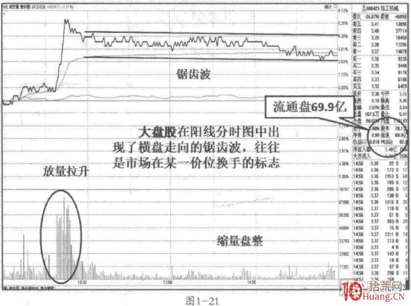 注意,這種橫盤的鋸齒波如果在分時圖的相對高位出現(xiàn)了縮量走勢,是一種典型的洗盤行為,洗盤完畢后還有一沖。而如果是放量的橫盤,則可能是主力的出貨行為,要引起高度警惕。見圖1-23.