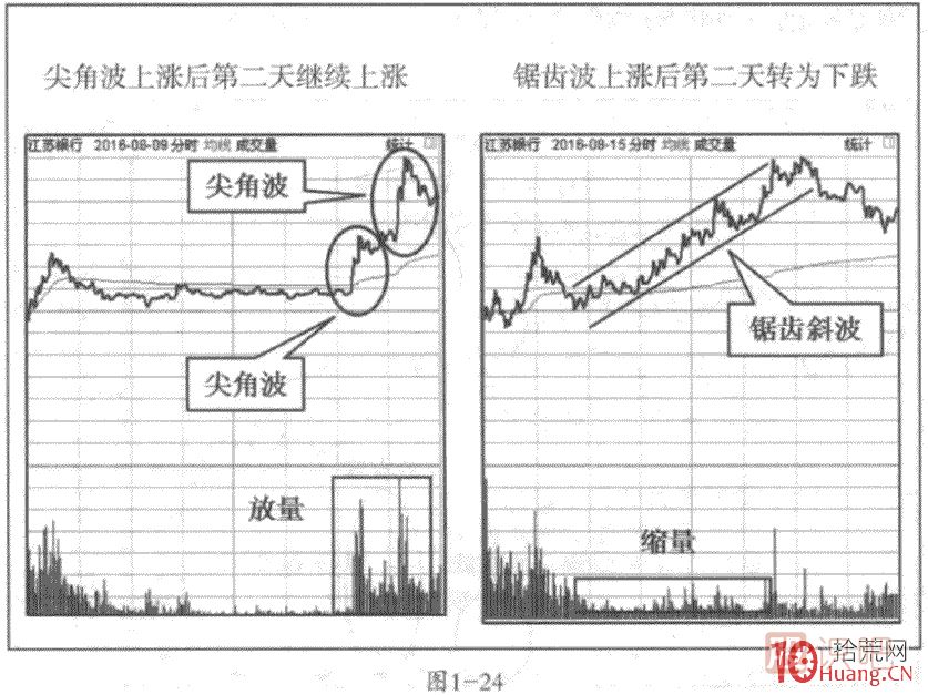 所謂鋸齒波,顧名思義,就是無論是上漲還是下跌的分時圖上,都是呈現(xiàn)出一種類似“鋸齒”狀態(tài)的走勢,也就是說股價在微幅波動下的單邊上漲和單邊下跌和橫盤走勢中(見圖1-12中右一圖所示),