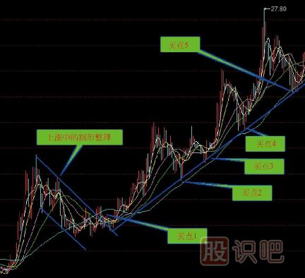1.在股價上升趨勢中,當(dāng)股價下跌而觸及股價上升趨勢線時,便是絕佳的買點(買進(jìn)信號),投資者可酌量買進(jìn)股票。