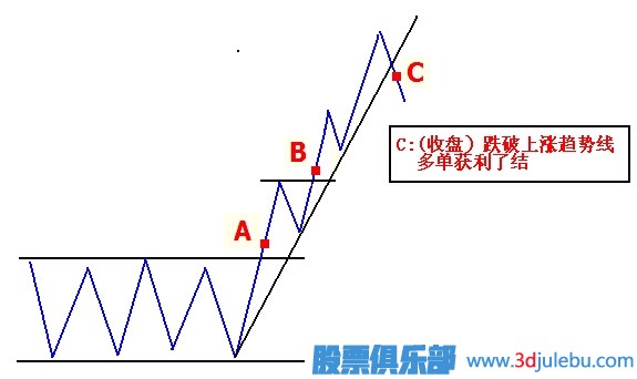 3、收盤跌破上漲趨勢線,多單獲利了結。