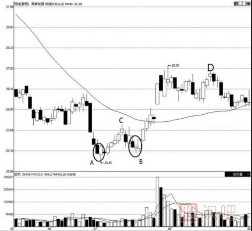 在操作上,第一種情況出現(xiàn)后要及時(shí)加倉,一旦反轉(zhuǎn)失敗跌破第一根K線低點(diǎn)即行止損;第二種情況出現(xiàn)后如果已建底倉,應(yīng)該在股價(jià)跌破第一根K線最高點(diǎn)時(shí)及時(shí)止損。
