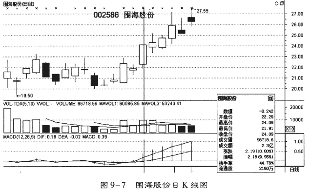 一旦投資者發(fā)現(xiàn)新股形呈現(xiàn)首次漲停的走勢,就可以在漲停的時候進(jìn)行追漲操作,或者在第二天積極建倉。這里重點突出的是,新上市的股票漲停走勢越是堅決,那么后期上漲行情的延續(xù)性也就越好。例如,圍海股份收出上市以來的首個漲停,如果此時果斷介入,之后短短5個交易日,每股可獲得3元的利潤,如圖9-7所示。