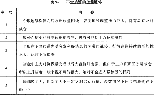 此外,除了上面談到的放量漲停投資時機(jī)的把握,這里還有幾種不宜追漲的情況,則應(yīng)警惕,如表9-1所示。