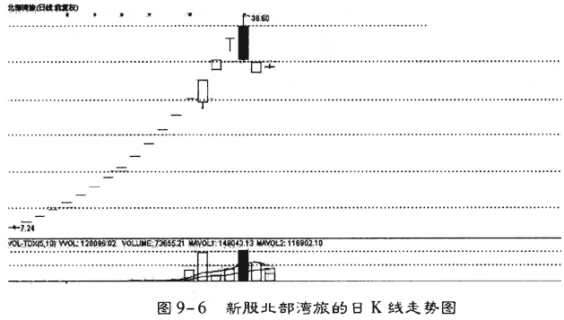 對于普通個股而言股價的漲停是很正常的,但是對于新股而言其第一個漲停板就是最好的操作時機(jī)。無論股價后期是否可以再度漲停,至少明天會出現(xiàn)慣性高開,圖9-6所示為2105年3月26日上市的北部灣旅游,盡管上市后連拉了13個漲停,但打開漲停后,走勢依然強(qiáng)勁,只要搶進(jìn)就能賺錢。
