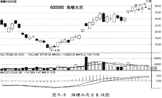 如圖9-8所示的海螺水泥出現(xiàn)第一個底部漲停,且從全天成交量看,量能適中,并沒有異常的巨量出現(xiàn),因此,我們不難判斷該股出現(xiàn)的第一個漲停板僅僅只是上漲的開始,整個后續(xù)行情的上漲幅度會比較大。