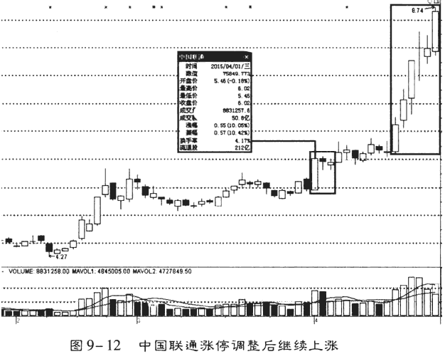 例如,中國聯(lián)通2015年4月1日出現(xiàn)漲停后股價進(jìn)入短暫的調(diào)整期,經(jīng)過約兩周的調(diào)整后股價一路飆升,如圖9-12所示。