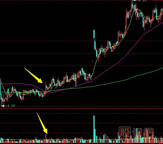 當(dāng)出現(xiàn)上漲初期的放量沖高走勢時(shí),股價(jià)應(yīng)已脫離底部區(qū)域,而且從底部區(qū)