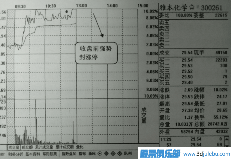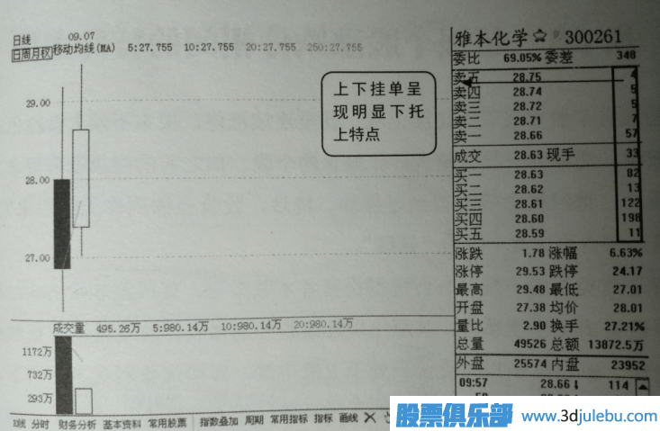 如圖5所示是雅本化學(300261) 的日k線界面,圖中顯示該股屬于剛上市第二天的新股,且為創(chuàng)業(yè)板,在當時炒新情緒高