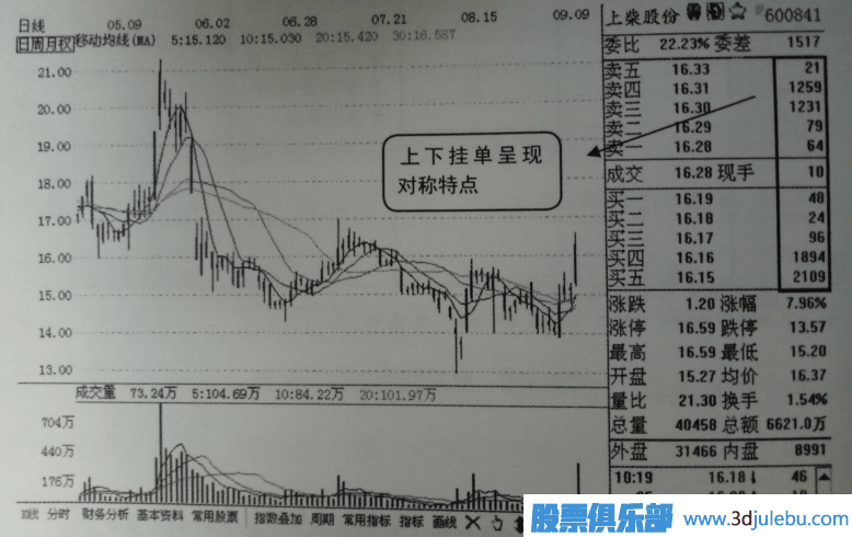 如圖1所示是上柴股份(600841) 的日K線界面,圖中顯示該股當天漲幅已經接近8%,且買賣檔出現(xiàn)較為明顯的對稱式蜂窩掛單特點,因此可說明股價當天漲停的概率偏大。