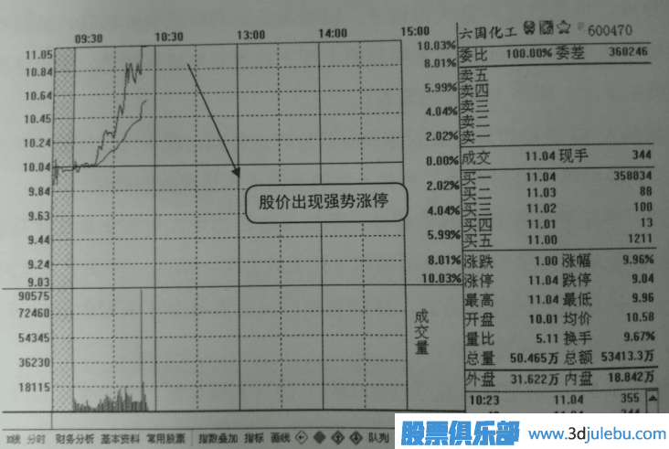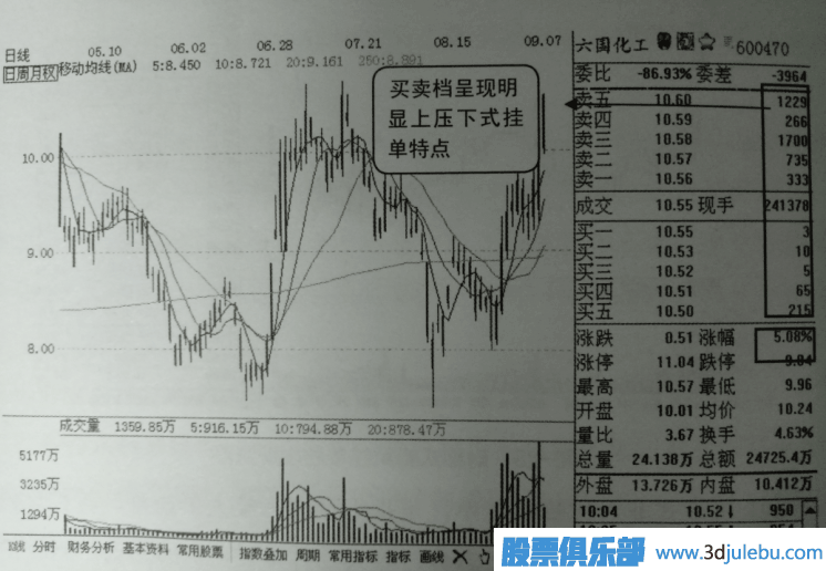 如圖3所示是六國化工的K線界面,圖中顯示該股當天當時已經上漲5個百分點,且外盤比內盤大得較多,已知當天農藥化肥板塊領漲,另外可觀察到當時的買賣檔已經出現(xiàn)非常明顯的上壓下式非對稱蜂窩掛單,說明該股當天法停概率很大,操作上可適當追入。