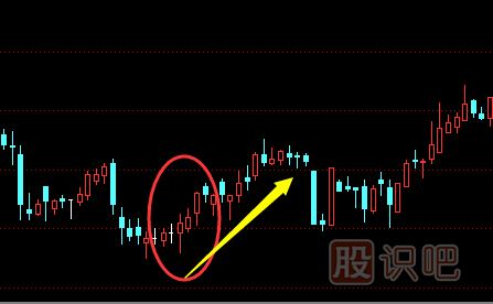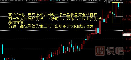 4。孕之兵K線圖。通常情況下我們把高位出現(xiàn)一根大陽線之后,緊接著在這根大陽線實(shí)體中間部位出現(xiàn)小陰線我們稱之下跌孕,反之,在低位出現(xiàn)一根大陰線后,緊接著在這根大陰線實(shí)體部位出現(xiàn)小陽線我們稱之為上漲孕,通常孕之反轉(zhuǎn)屬于被動性的較多,因而反轉(zhuǎn)的速度較慢。如圖: